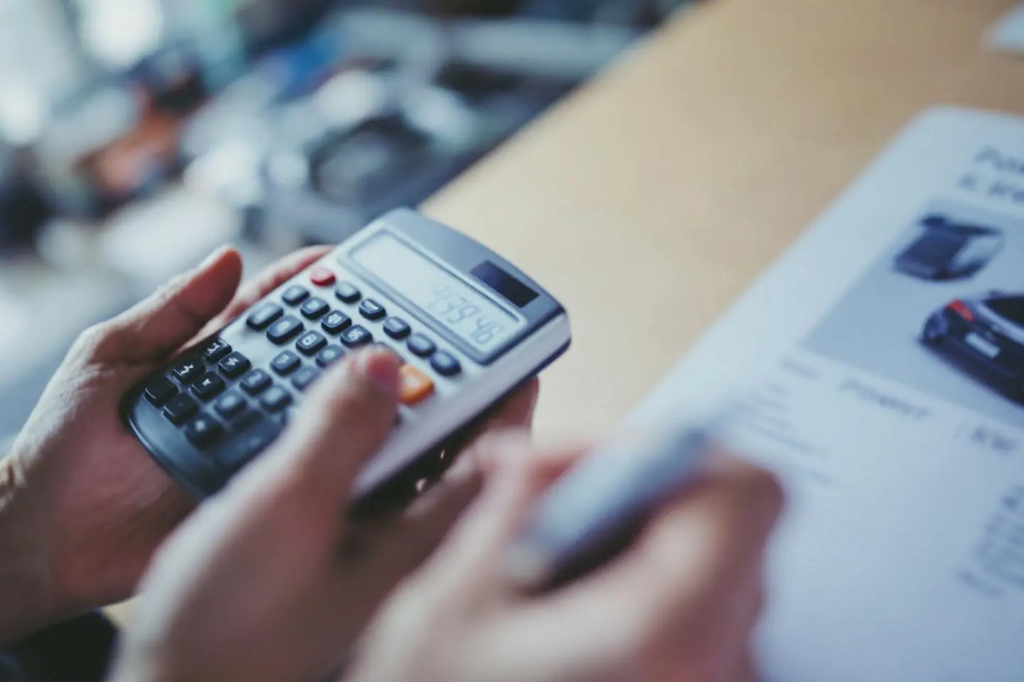 ruke s kalkulatorom pored tehničkih specifikacija vozila simbolizirajući izračun cijena osiguranja vozila po kw