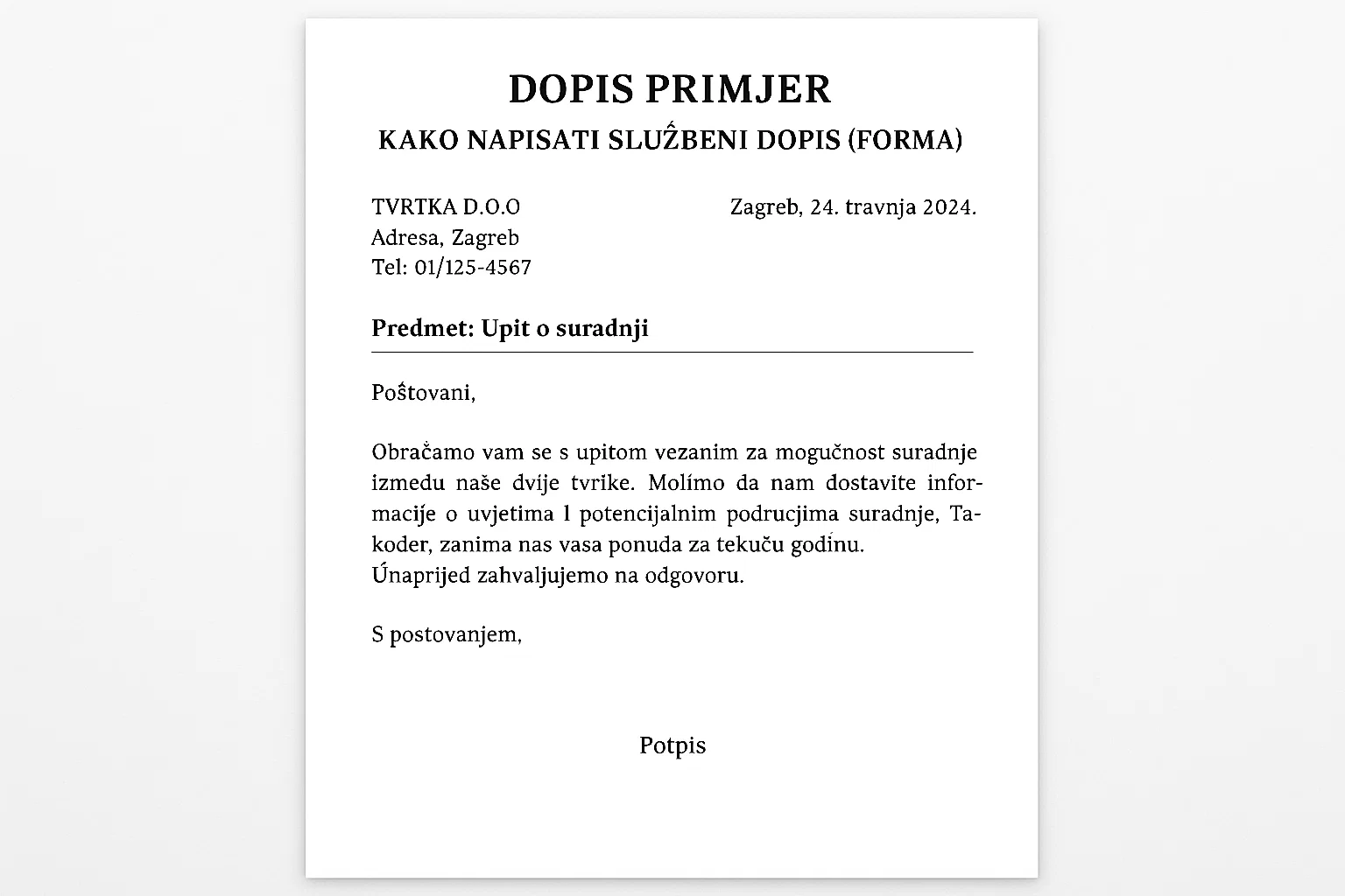 • Struktura je kralj: Svaki službeni dopis ima istu strukturu—vaši podaci, podaci primatelja, datum, predmet, sadržaj, pozdrav i potpis. Držite se toga.