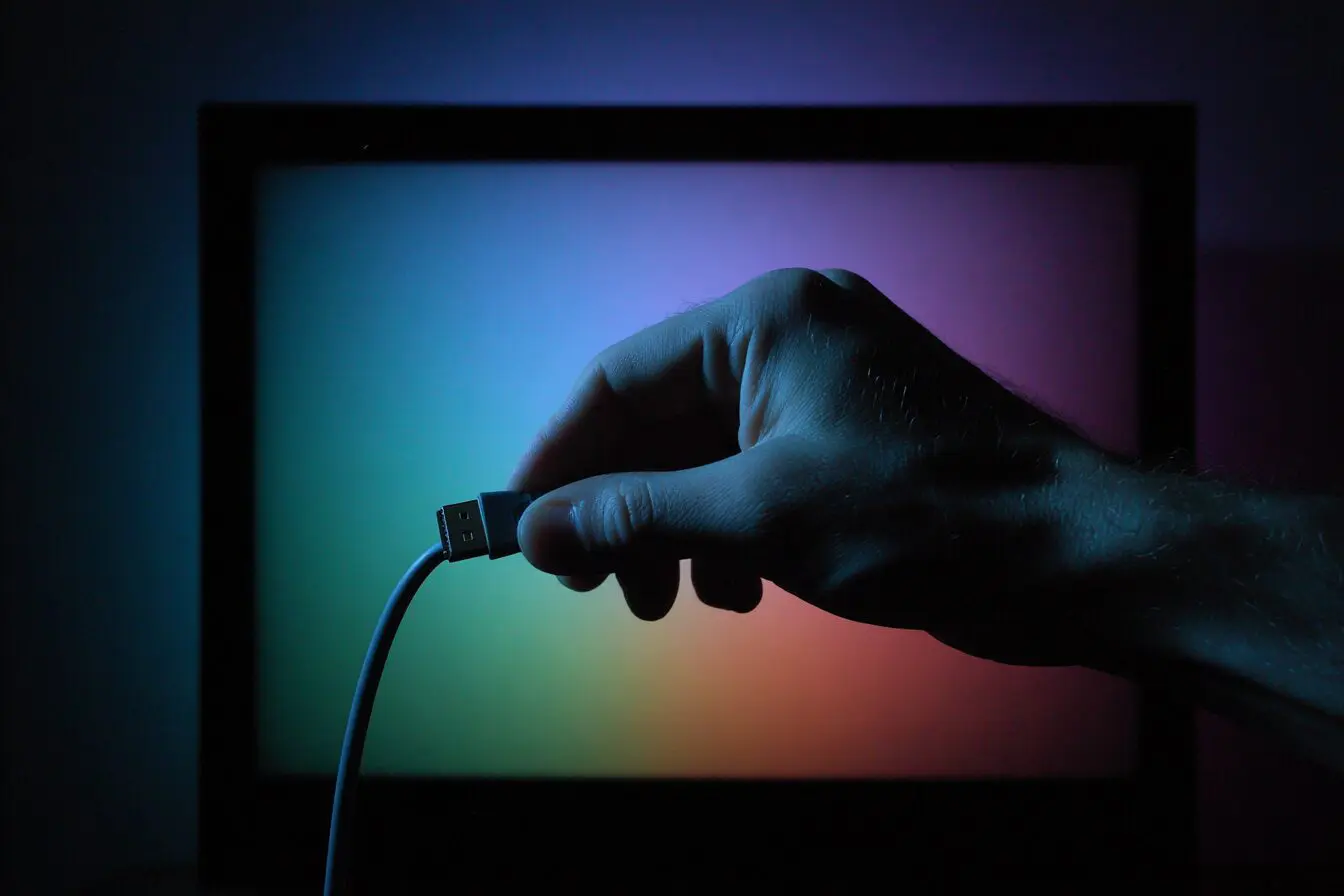 Ruka koja spaja kabel u TV nakon čega se pojavljuje slika kao rješenje za kako vratiti sliku na TV