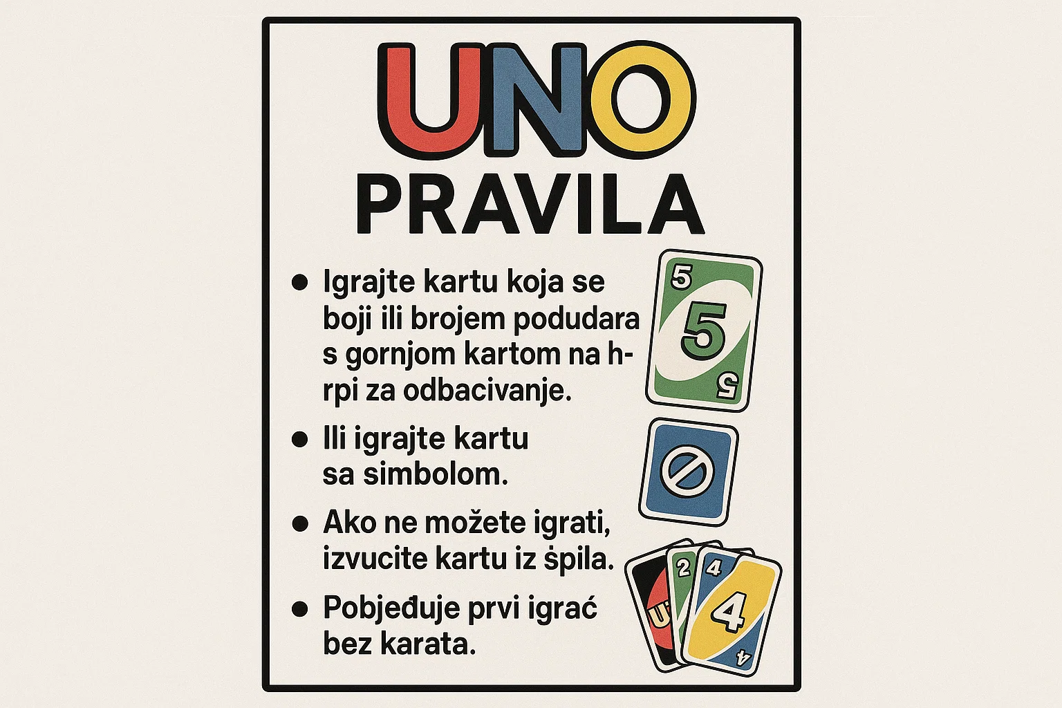 Nadam se da vam je ovaj vodič razjasnio sve dileme. Sada ste naoružani znanjem. Znate kada viknuti “UNO”, znate kako legalno (ili ilegalno) koristiti +4 kartu i znate da službena pravila zabranjuju slaganje.